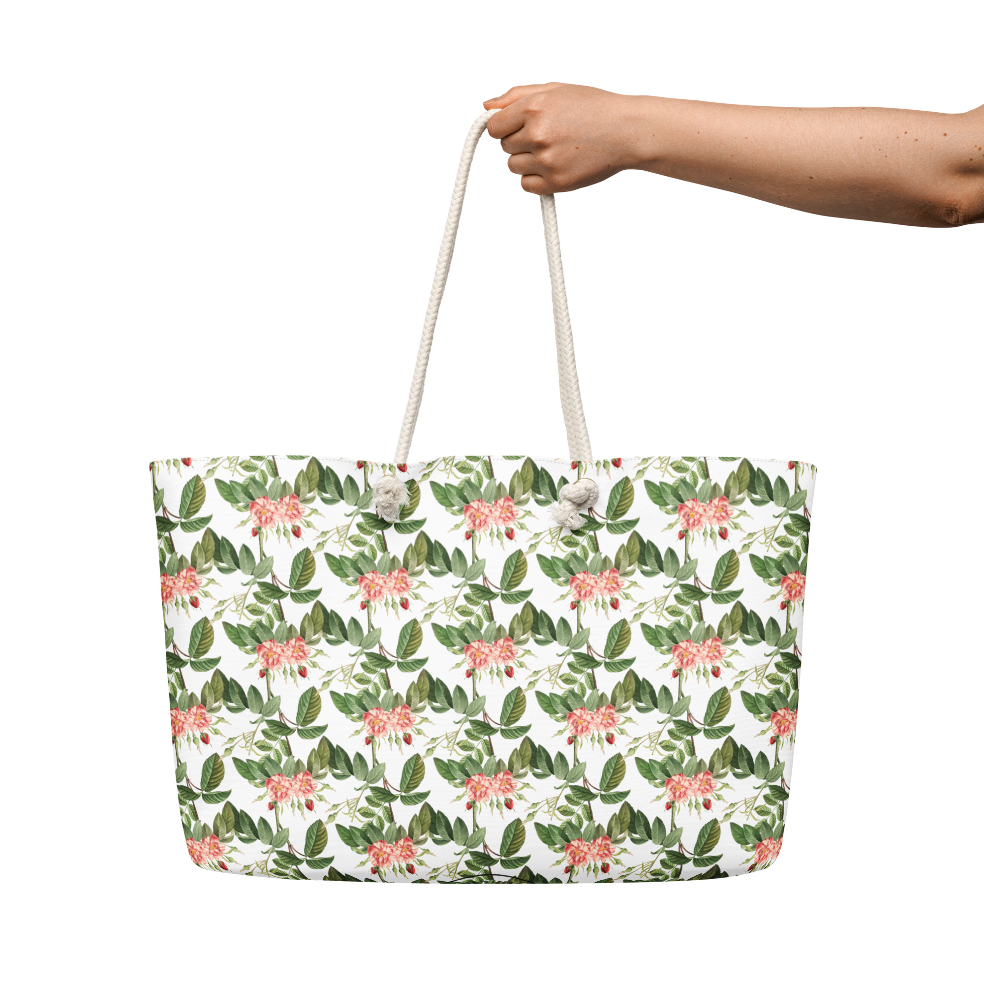 Fresh, airy, and garden-in-morning light. Soft coral-pink blossoms with lush green leaves give it a calm, nature-forward charm, perfect for an everyday tote.