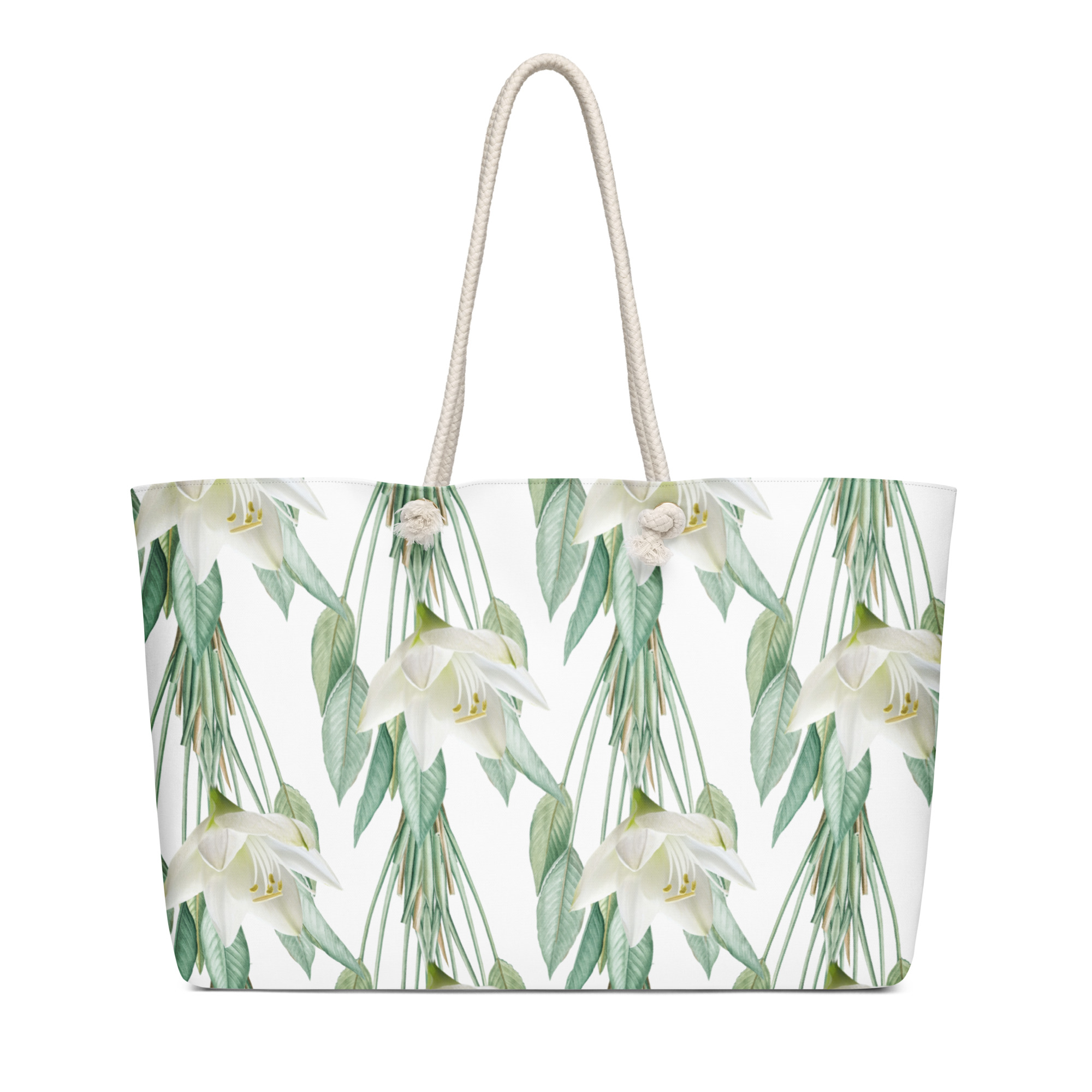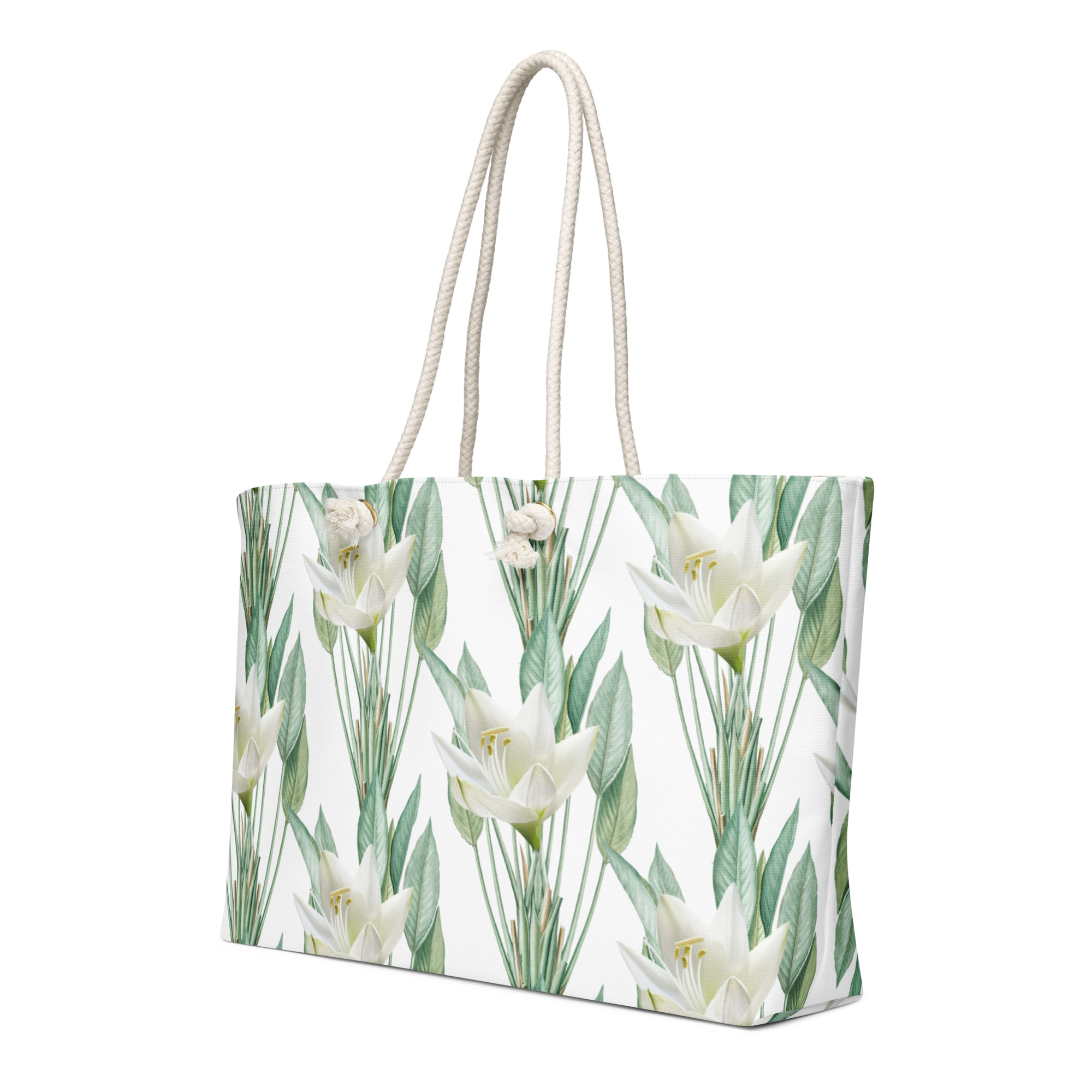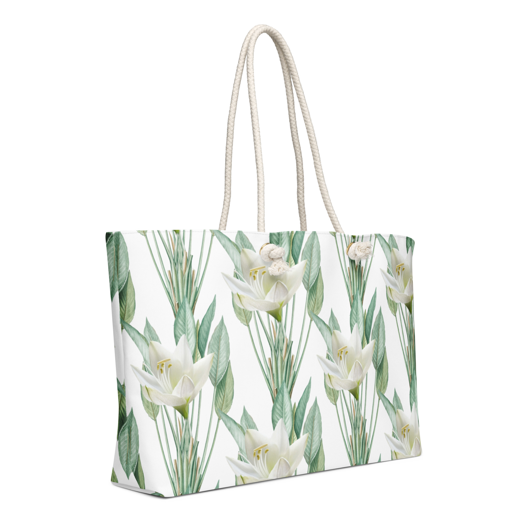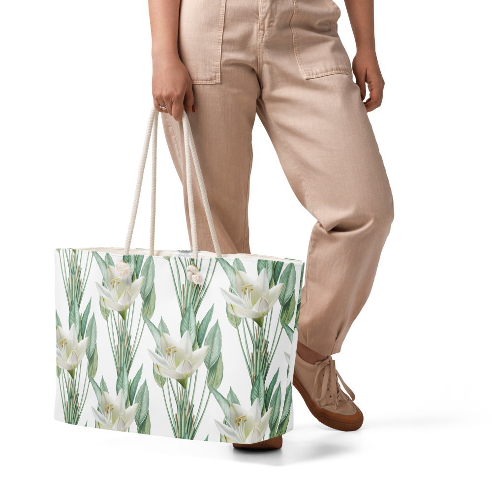 Soft Ivory lily, sage-green botanical floral weekend tote bag, brings out the calm and elegant and timeless of Verse & Vessel.